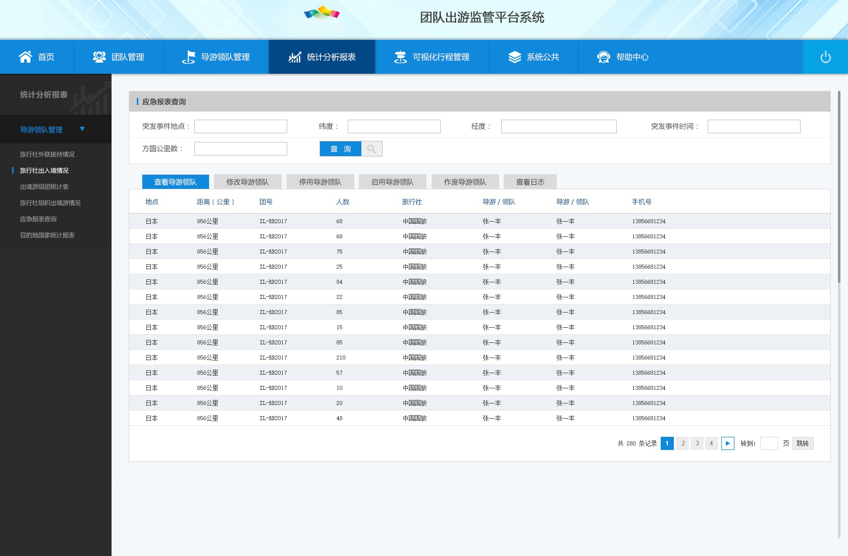 3) 統(tǒng)計(jì)分析報(bào)表:目的地國(guó)家統(tǒng)計(jì)表、應(yīng)急報(bào)表查詢、旅行社外聯(lián)接待情況、旅行社出入境情況、出境游組團(tuán)統(tǒng)計(jì)表。