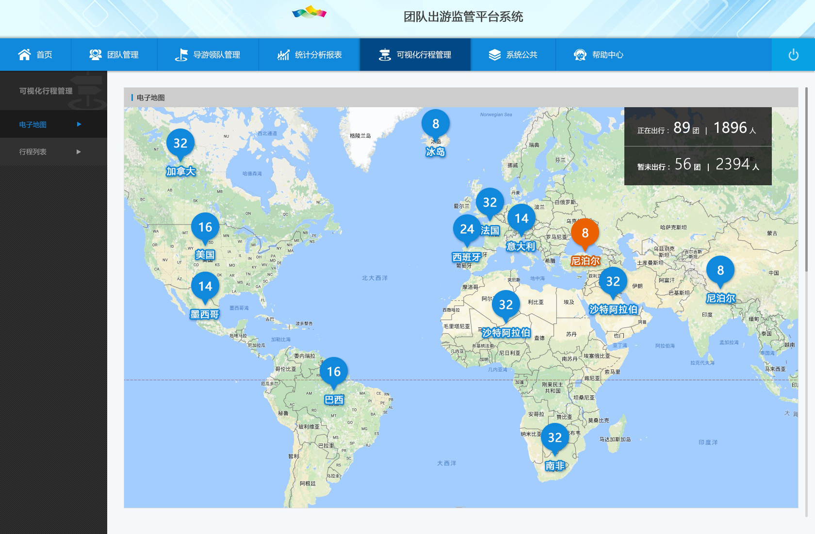 團(tuán)隊(duì)出境旅游監(jiān)測(cè)與分析對(duì)接國(guó)家旅游團(tuán)隊(duì)管理系統(tǒng)數(shù)據(jù),通過對(duì)旅游團(tuán)電子行程單和旅游合同數(shù)據(jù)的接入,實(shí)現(xiàn)對(duì)出境旅游團(tuán)隊(duì)監(jiān)測(cè)監(jiān)管,方便在發(fā)生旅游突發(fā)事件時(shí)迅速開展救援、服務(wù)工作。