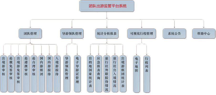 根據(jù)團(tuán)隊(duì)出游業(yè)務(wù)需求及出境旅游行業(yè)特點(diǎn),出境旅游團(tuán)隊(duì)監(jiān)測(cè)與分析功能包括團(tuán)隊(duì)管理、導(dǎo)游/領(lǐng)隊(duì)管理、統(tǒng)計(jì)分析報(bào)表、可視化行程管理和系統(tǒng)公告、幫助中心六大部分。