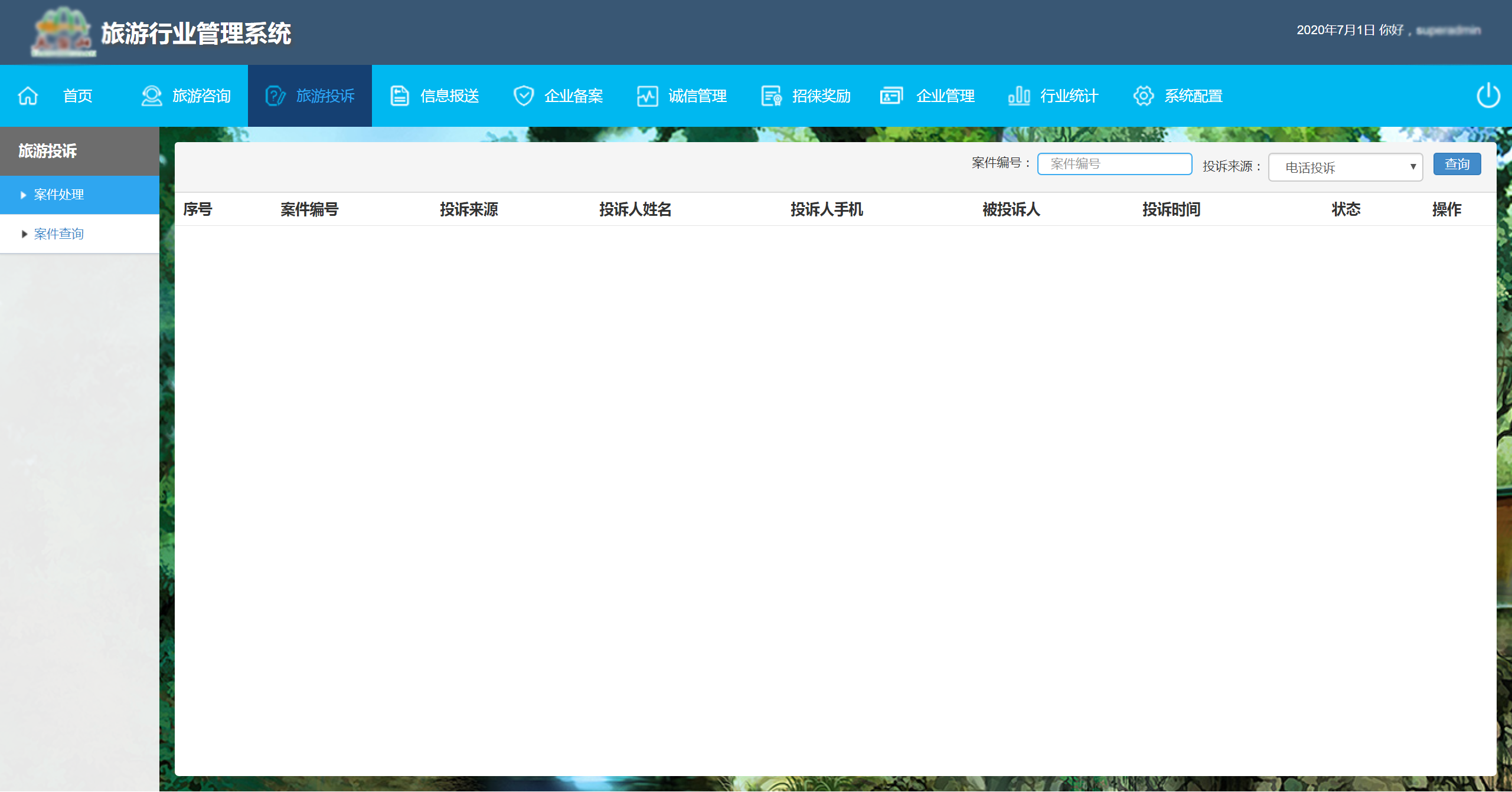包括咨詢與投訴管理、旅游行業(yè)與涉旅企業(yè)管理、旅游誠信管理等子系統(tǒng),提供游客投訴渠道,對游客投訴的問題進(jìn)行流程化處理、追溯,提升游客游覽滿意度。圍繞旅游企業(yè)信息報(bào)送、旅游企業(yè)備案、旅游業(yè)態(tài)評定、旅游行業(yè)統(tǒng)計(jì)、旅游從業(yè)人員管理、游客招徠獎勵等全方位管理。針對涉旅商家的誠信評價、不良商家曝光、投訴反饋、商家信用等全面監(jiān)管。
