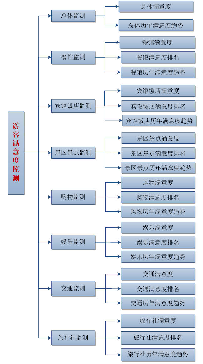 ● 總體監(jiān)測:監(jiān)測當前游客對旅游行業(yè)的總體滿意度,并分析歷年總體滿意度的發(fā)展趨勢;