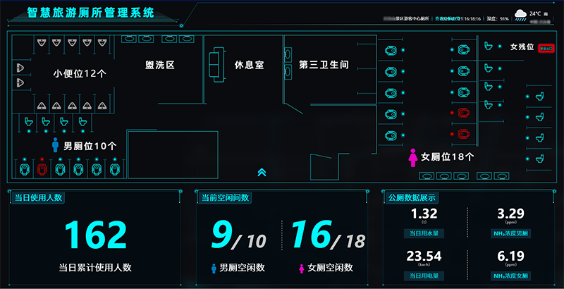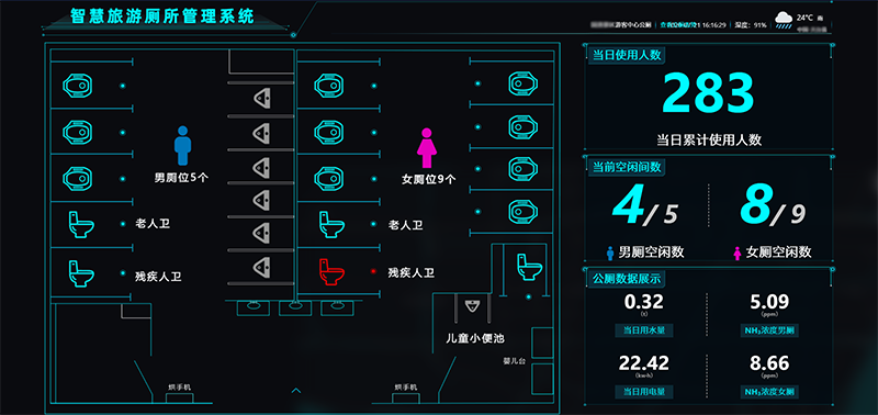 可以通過公廁外墻上的電子顯示屏,清晰的了解男、女廁和第三廁位分布情況,紅色亮起表示這個公廁目前有人使用。綠燈表示公廁空閑。通過這種直觀的方式就可以了解、判斷哪個廁位可用。公廁每個蹲位都安裝提供一鍵緊急呼叫按鈕,使用者按下呼叫鈴,工作人員將趕到廁所提供幫助。公廁門口架設(shè)蹲位顯示器,界面化的顯示廁所實(shí)際情況,同時還可以可投放第三方廣告商,第三方自動售貨機(jī)。