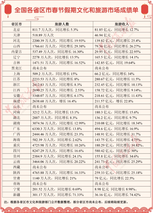 連日來,全國各省區(qū)市文化和旅游部門陸續(xù)發(fā)布了2019年春節(jié)假期文化和旅游市場主要數(shù)據(jù),小編收集整理了相關(guān)數(shù)據(jù),讓我們一起來看看這份亮麗的成績單吧!