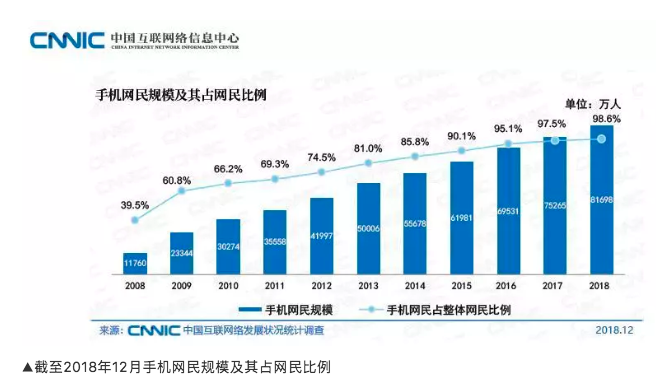 2019年2月發(fā)布的第43次《中國互聯(lián)網(wǎng)絡(luò)發(fā)展?fàn)顩r統(tǒng)計(jì)報(bào)告》顯示,截至2018年12月,我國網(wǎng)民規(guī)模為8.29億,全年新增網(wǎng)民5653萬;我國手機(jī)網(wǎng)民規(guī)模為8.17億,全年新增手機(jī)網(wǎng)民6433萬,網(wǎng)民使用手機(jī)上網(wǎng)的比例由2017年底的97.5%提升至2018年的98.6%。