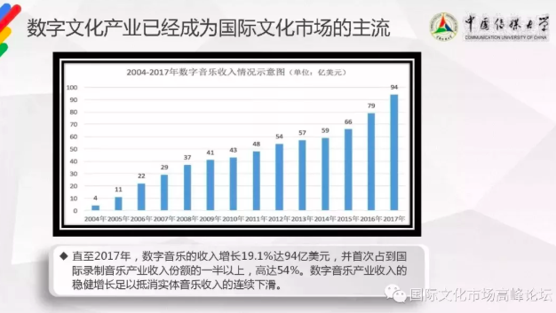 《國際文化市場報(bào)告2018》顯示,實(shí)體音樂產(chǎn)業(yè)總收入自1999年開始幾乎是一路下滑,2010年跌破三位數(shù),2017年已跌至52億美元,由市場占比100%下滑為占比僅30%。直至2017年,數(shù)字音樂的收入增長19.1%達(dá)94億美元,并首次占到國際錄制音樂產(chǎn)業(yè)收入份額的一半以上,高達(dá)54%。數(shù)字音樂產(chǎn)業(yè)收入的穩(wěn)健增長足以抵消實(shí)體音樂收入的連續(xù)下滑。