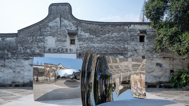 《雙?!肥俏鳀耪蛊分小傲髁俊弊疃嗟恼蛊?,每天吸引著游客駐足拍照。兩面不銹鋼曲面的鏡像,容納江南水鄉(xiāng)斑駁墻面和如織游人,倒置、正向的鏡面,反射出的虛像向無限深處展開。