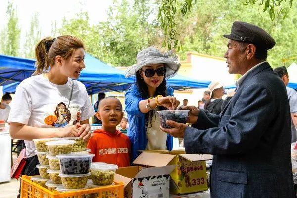 5月19日,游客在尉犁縣興平鎮(zhèn)哈拉洪村購買當(dāng)?shù)赝撂禺a(chǎn)品。 □李飛攝