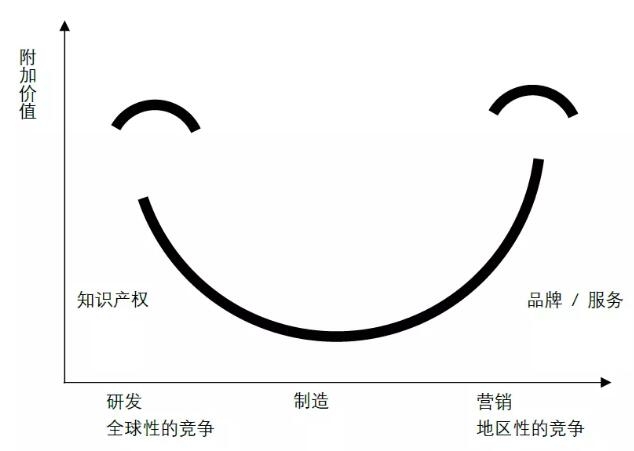 圖3 微笑曲線:微笑曲線就是一條說明產(chǎn)業(yè)附加價值的曲線,從橫軸來看,由左至右代表產(chǎn)業(yè)的上中下游,左邊是研發(fā),中間是制造,右邊是營銷;縱軸則代表附加價值的高低。以市場競爭形態(tài)來說,曲線左邊的研發(fā)是全球性的競爭,右邊的營銷是地區(qū)性的競爭。