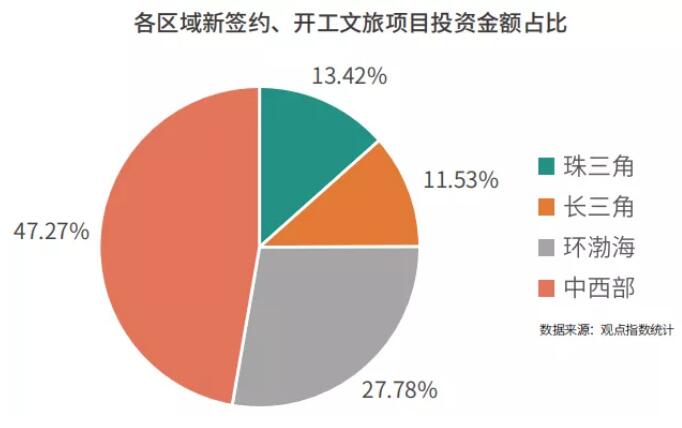 上半年,珠三角、長三角、環(huán)渤海、中西部區(qū)域新簽約、開工文旅項目涉及投資金額占新增投資總金額分別為13.42%、11.53%、27.78%、47.27%,其中,中西部地區(qū)幾乎占了1-6月新增文旅項目總投資的一半。