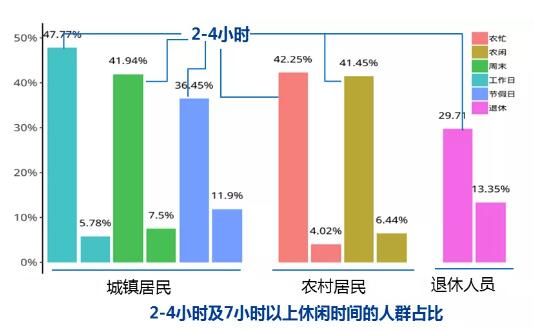 從休閑時(shí)間來看,城鄉(xiāng)居民休閑時(shí)間隨可支配時(shí)間變化而波動(dòng),工作日和農(nóng)忙期間城鄉(xiāng)居民勞動(dòng)強(qiáng)度大,可支配時(shí)間少,休閑時(shí)間相對(duì)較短;城鄉(xiāng)居民每日休閑時(shí)間平均以2-4小時(shí)為主。數(shù)據(jù)顯示,33.6%的受訪城鎮(zhèn)居民工作日工作時(shí)間達(dá)9小時(shí)以上;有40%的城鄉(xiāng)居民在工作日、周末、農(nóng)忙、農(nóng)閑時(shí)每日休閑時(shí)間為2-4小時(shí),而休閑時(shí)間7小時(shí)以上的城鄉(xiāng)居民占比隨可支配時(shí)間增多而依次提升;退休無業(yè)人員由于不受時(shí)間限制,休閑時(shí)間7小時(shí)以上的受訪者占比最高,為13.4%。