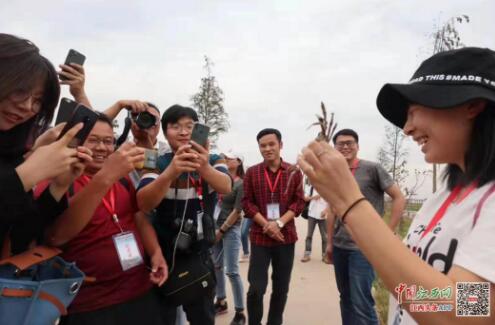 紅網(wǎng)記者彭夢汝被網(wǎng)媒記者圍拍(舒言誠拍攝)