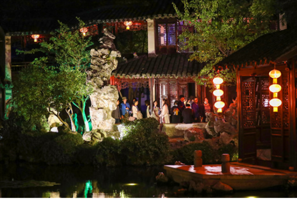 暮色漸濃,退思園內(nèi)投影的明月悄然爬上粉墻,幾位銀發(fā)游客在導(dǎo)游陪同下緩步其間。園外水道中,最后幾艘夜游船正載著游客穿過橋洞,船槳劃破倒映著燈籠光影的水面。