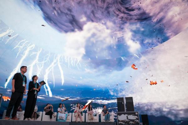 國內(nèi)首個(gè)MR劇游式導(dǎo)覽系統(tǒng)《黑暗傳與大富翁》成為展會(huì)焦點(diǎn)。觀眾戴上MR設(shè)備后,仰頭能看到展館穹頂幻化為浩瀚星空,數(shù)十米高的盤古大神跨越人群,靈動(dòng)的七色鹿在腳邊跳躍。