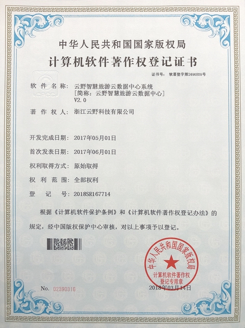 《云野智慧旅游云數(shù)據(jù)中心系統(tǒng)V2.0》于2018年3月14日被正式授予《中華人民共和國國家版權(quán)局計算機軟件著作權(quán)登記證書》,登記號為2018SR167714。