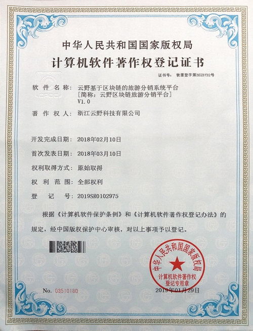 《云野基于區(qū)塊鏈的旅游分銷系統(tǒng)平臺V1.0》于2019年1月29日被正式授予《中華人民共和國國家版權(quán)局計算機軟件著作權(quán)登記證書》,登記號為2019SR102975。