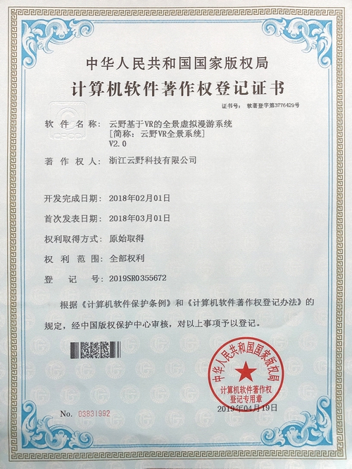 《云野基于VR的全景虛擬漫游系統(tǒng)V2.0》于2019年4月19日被正式授予《中華人民共和國國家版權(quán)局計算機軟件著作權(quán)登記證書》,登記號為2019SR355672。