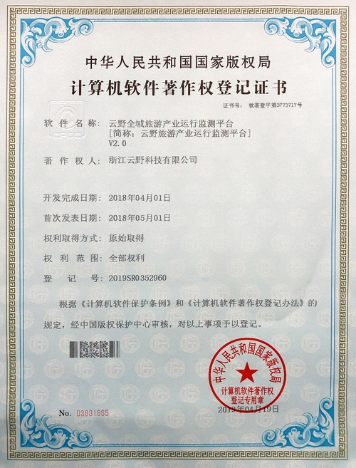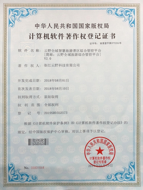 《云野全域智慧旅游景區(qū)綜合管控平臺V2.0》于2019年4月19日被正式授予《中華人民共和國國家版權(quán)局計算機軟件著作權(quán)登記證書》,登記號為2019SR0352573。