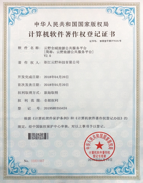 《云野全域旅游公共服務(wù)平臺V2.0》于2019年4月19日被正式授予《中華人民共和國國家版權(quán)局計算機軟件著作權(quán)登記證書》,登記號為2019SR355424。
