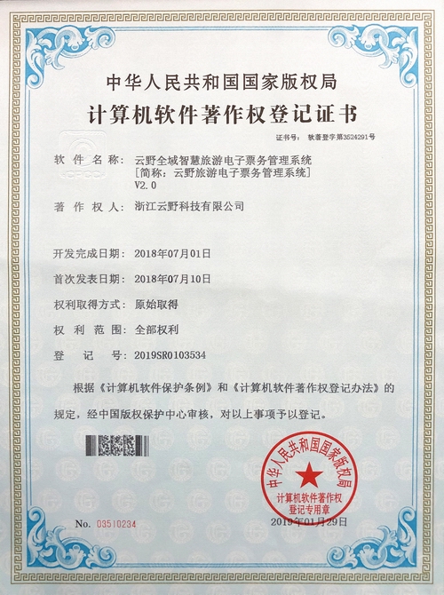 《云野全域智慧旅游電子票務(wù)管理系統(tǒng)V2.0》于2019年1月29日被正式授予《中華人民共和國國家版權(quán)局計算機軟件著作權(quán)登記證書》,登記號為2019SR0103534。