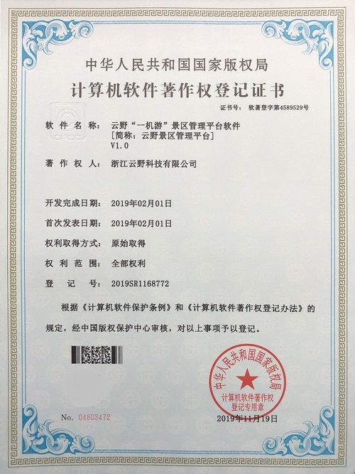 《云野“一機游”景區(qū)管理平臺軟件V1.0》于2019年11月19日被正式授予《中華人民共和國國家版權(quán)局計算機軟件著作權(quán)登記證書》,登記號為2019SR1168772。