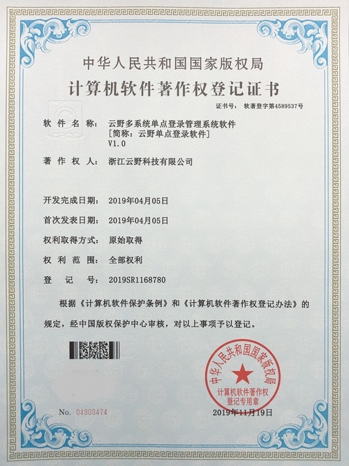 《云野多系統(tǒng)單點登錄管理系統(tǒng)軟件V1.0》于2019年11月19日被正式授予《中華人民共和國國家版權(quán)局計算機軟件著作權(quán)登記證書》,登記號為2019SR1168780。