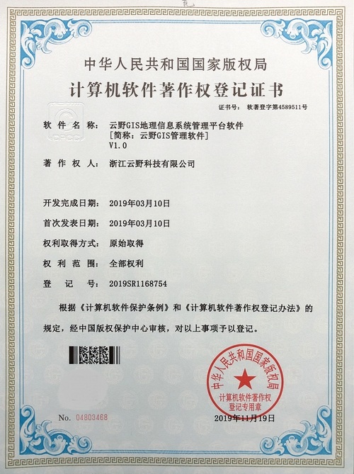 《云野GIS地理信息系統(tǒng)管理平臺軟件V1.0》于2019年11月19日被正式授予《中華人民共和國國家版權(quán)局計算機軟件著作權(quán)登記證書》,登記號為2019SR1168754。