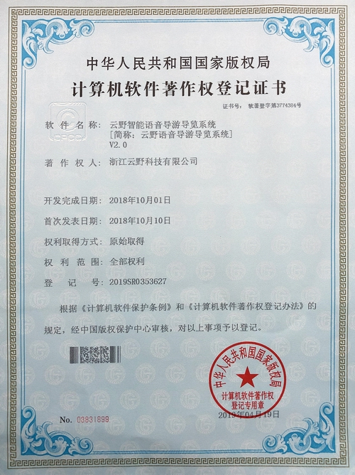 《云野智能語音導(dǎo)游導(dǎo)覽系統(tǒng)V2.0》于2019年4月19日被正式授予《中華人民共和國國家版權(quán)局計算機軟件著作權(quán)登記證書》,登記號為2019SR0353627。