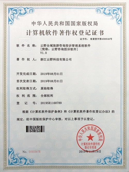《云野全域旅游咨詢投訴管理系統(tǒng)軟件V1.0》于2019年11月19日被正式授予《中華人民共和國國家版權(quán)局計算機軟件著作權(quán)登記證書》,登記號為2019SR1168789。