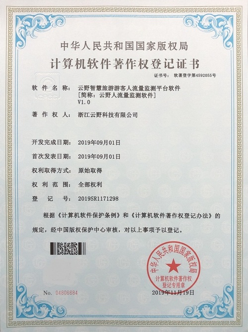 《云野智慧旅游游客人流量監(jiān)測平臺軟件V1.0》于2019年11月19日被正式授予《中華人民共和國國家版權(quán)局計算機軟件著作權(quán)登記證書》,登記號為2019SR1171298。
