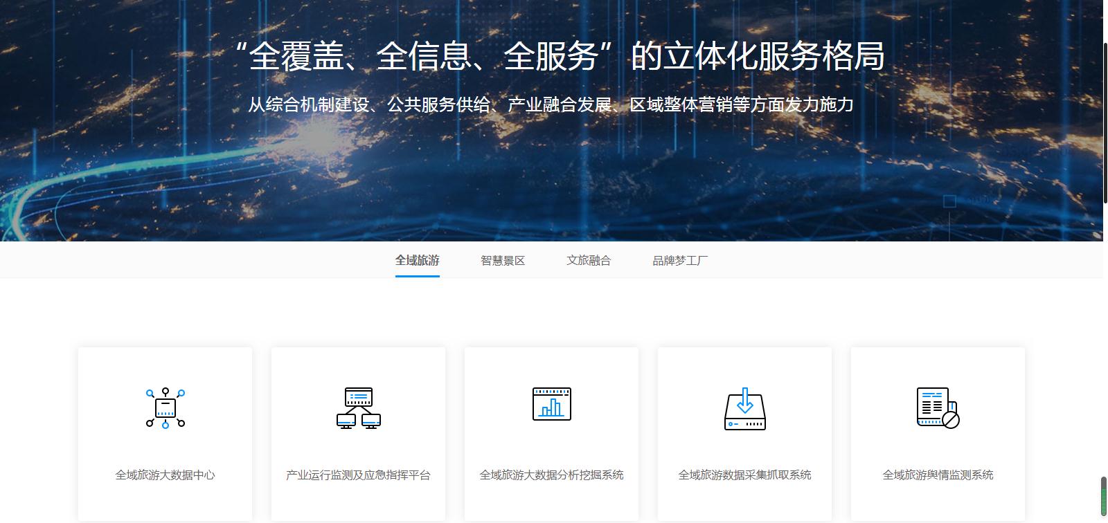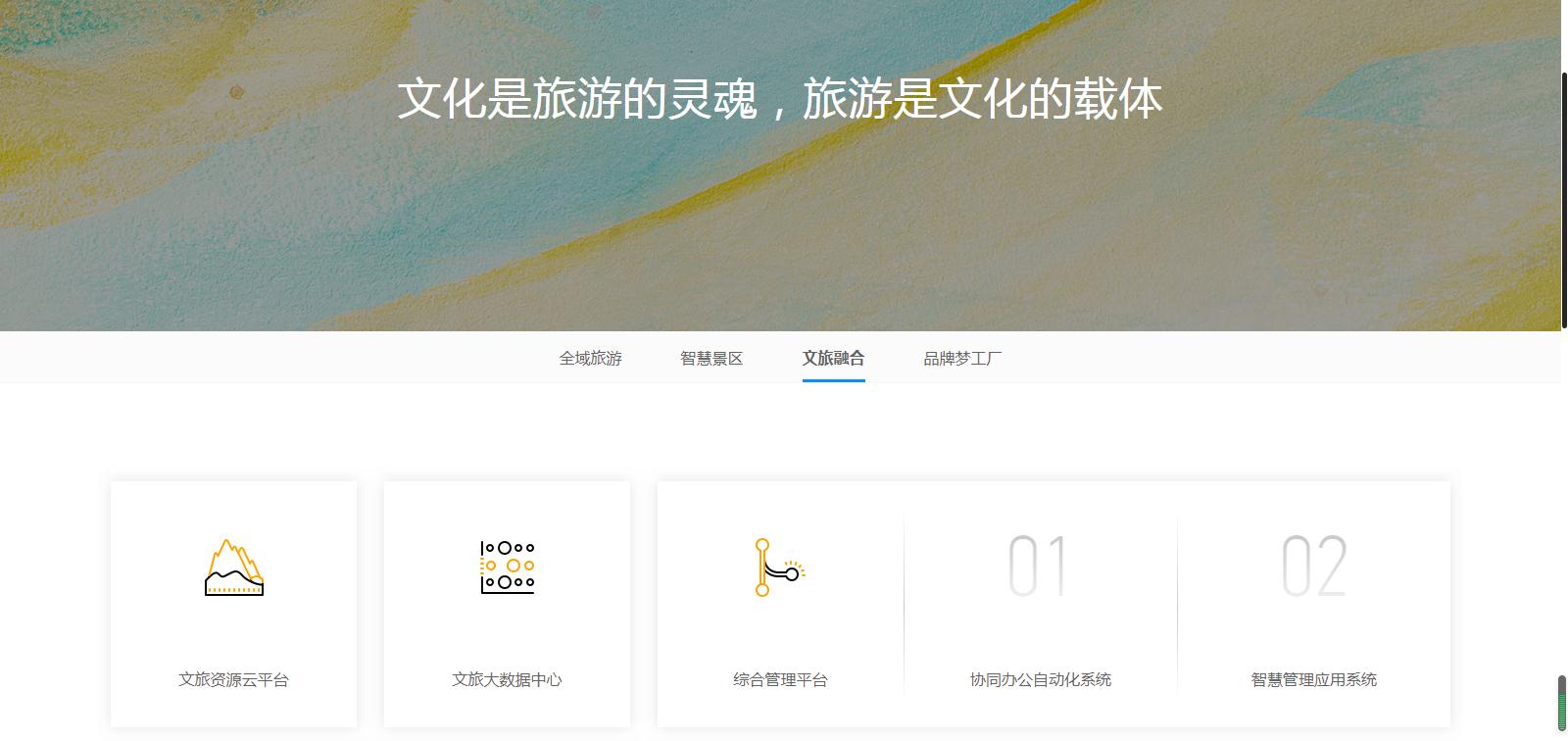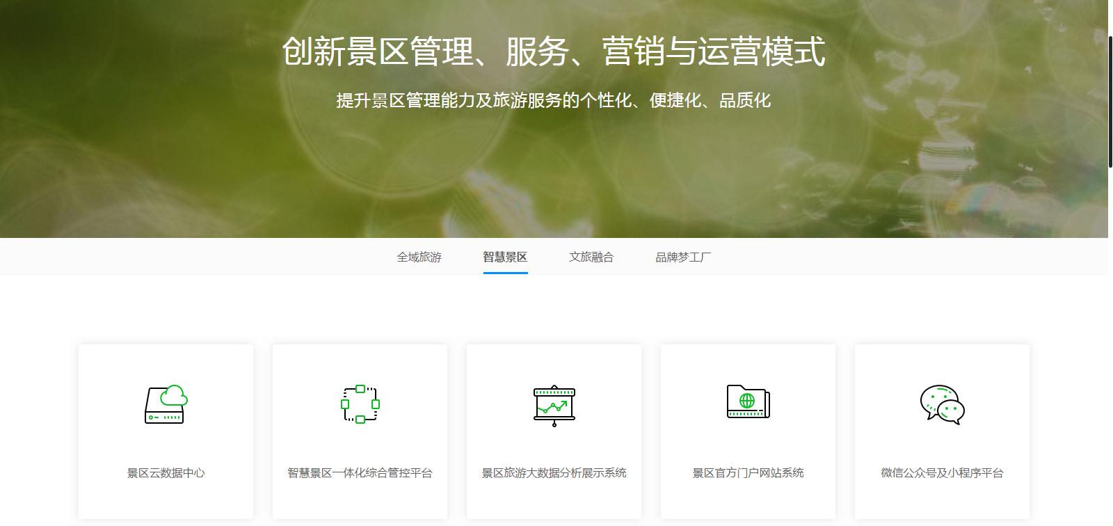 該產(chǎn)品模塊主要分為全域旅游、智慧景區(qū)、文旅融合、品牌夢(mèng)工廠四大模塊,從硬件軟件到系統(tǒng)開(kāi)發(fā),從文案策劃到設(shè)計(jì)創(chuàng)新,所有產(chǎn)品一應(yīng)俱全,分類(lèi)清晰,方便客戶(hù)針對(duì)自身需求尋找對(duì)應(yīng)的產(chǎn)品。