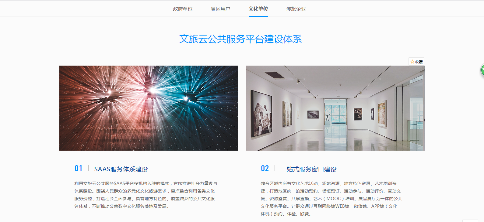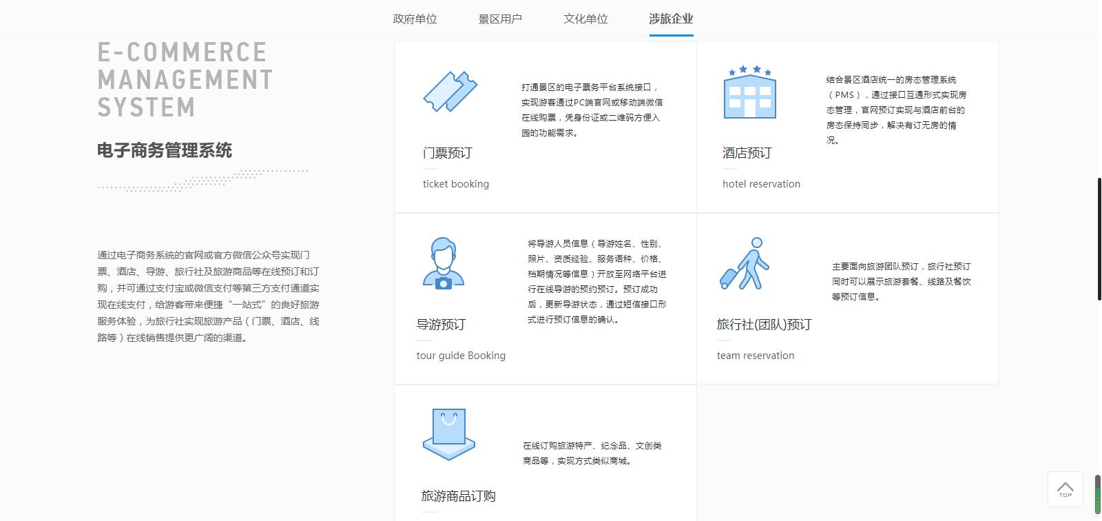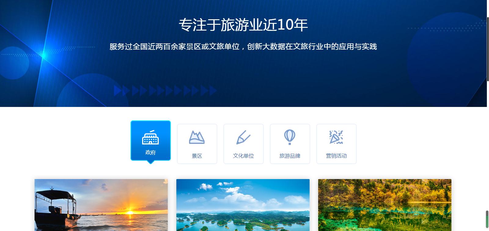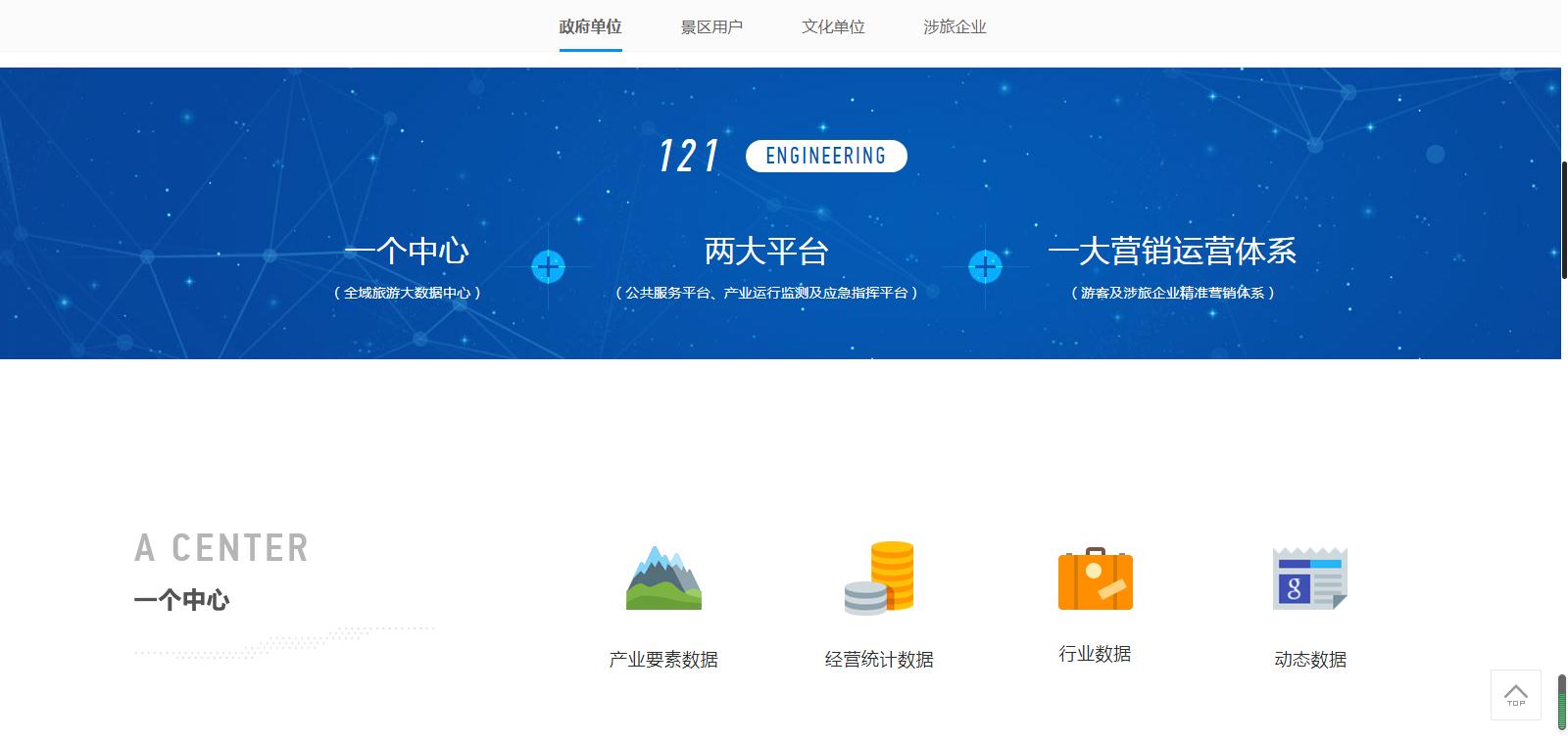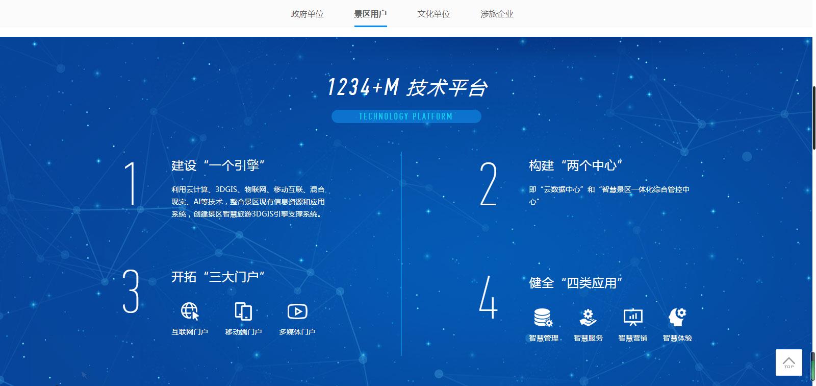 針對(duì)不同用戶(hù)屬性,分為政府單位、景區(qū)用戶(hù)、文化單位、涉旅企業(yè)。為不同行業(yè)客戶(hù)及合作伙伴,提供更為詳盡的方案支持,如政府單位的全域旅游“121工程”、景區(qū)用戶(hù)的“1234 M”技術(shù)、文化單位的服務(wù)平臺(tái)建設(shè)體系、涉旅企業(yè)的電子商務(wù)系統(tǒng)和活動(dòng)營(yíng)銷(xiāo)平臺(tái)。